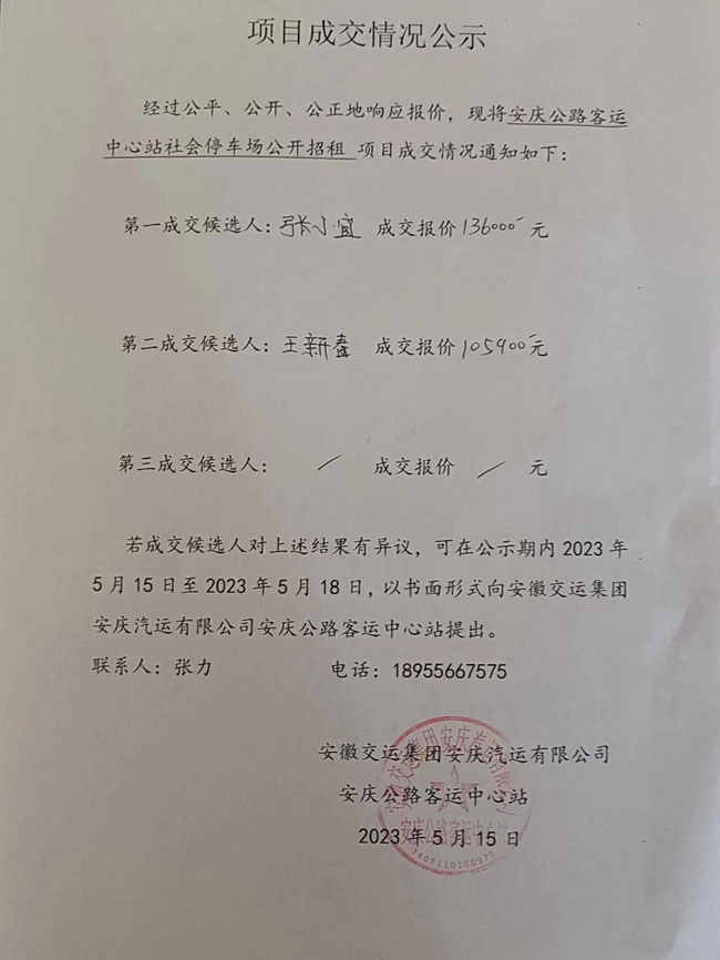 安慶中心站社會(huì )停車(chē)場(chǎng)公開(kāi)招租結果公示