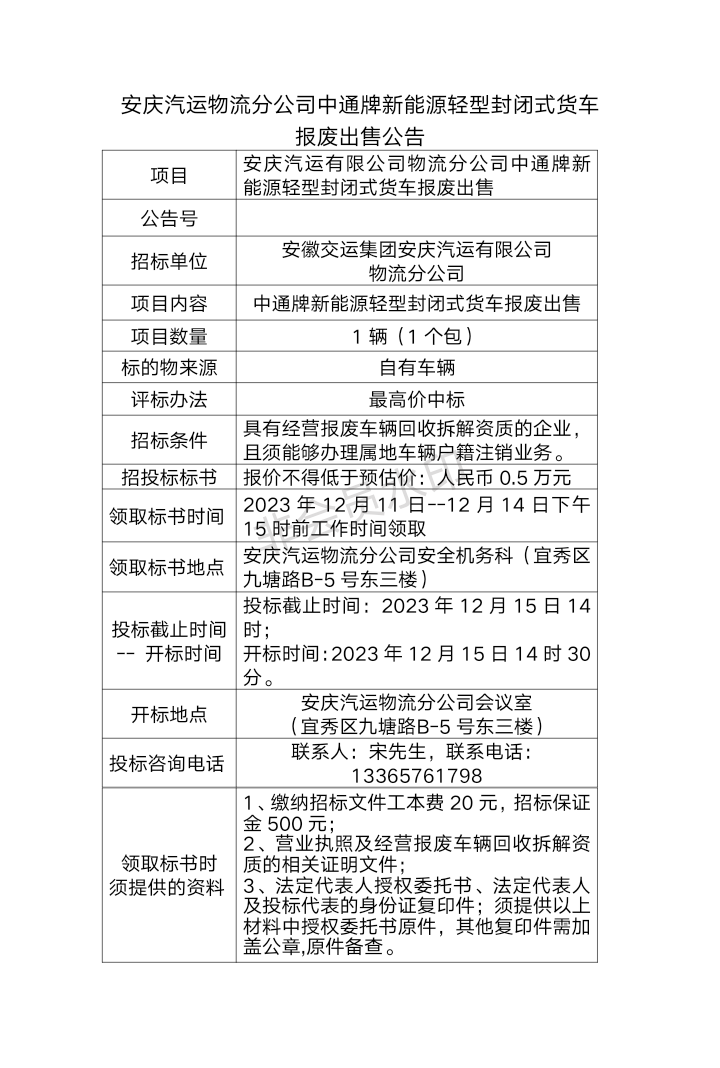 安慶汽運物流分公司中通牌新能源輕型封閉式貨車(chē) 報廢出售公告