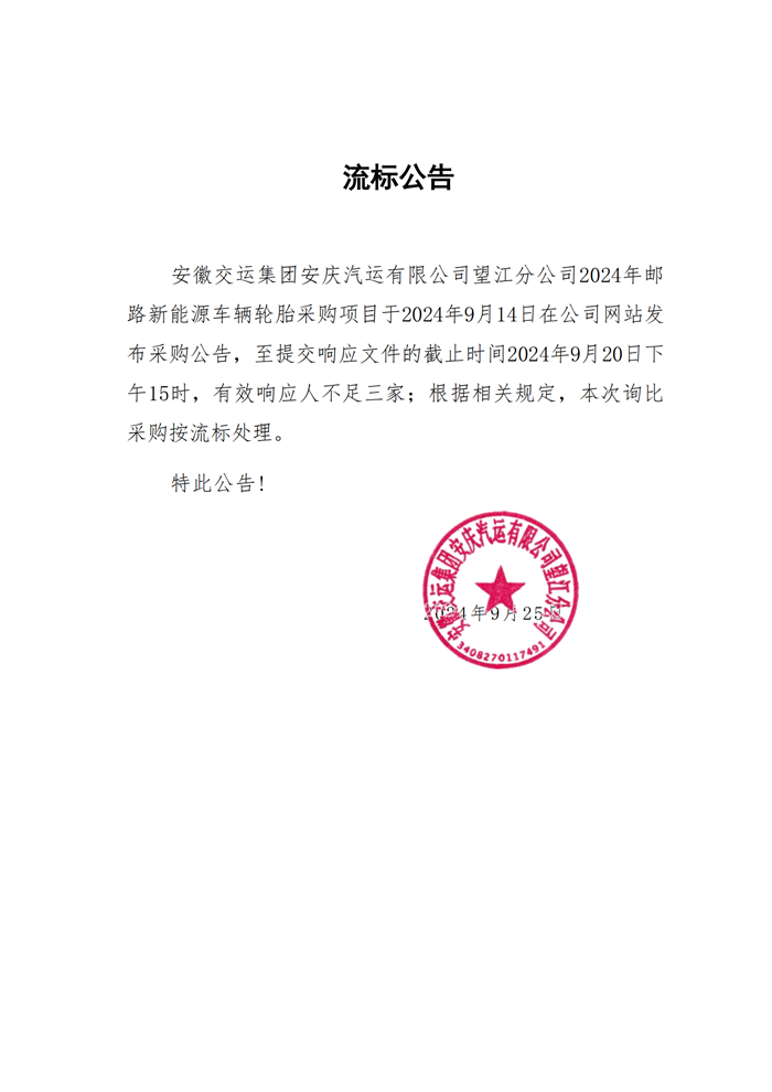 望江分公司郵路新能源車(chē)輛輪胎采購流標公告