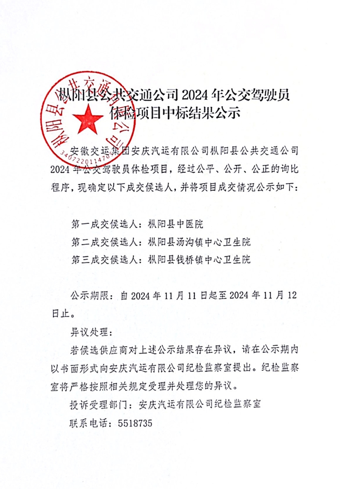 樅陽(yáng)公交駕駛員2024年體檢項目中標公告